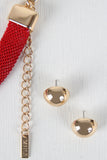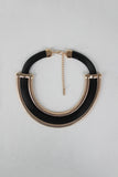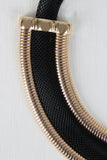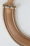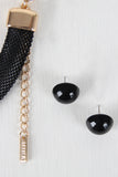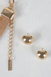 This statement piece necklace features a flat tube mesh chain contrasting a glossy omega chain with an adjustable hook closure. Necklace includes matching earrings.