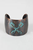 This chic cuff bracelet features a vintage hammered metallic band, and outlined crossed arrows design. Open ends for easy on/off.
