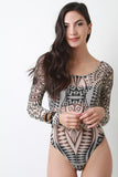 Abstract Tribal Long Sleeve Backless Mesh Bodysuit
