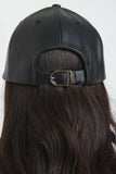 This baseball style hat features a traditional six panel design and curved brim, vegan leather fabrication, with an adjustable buckle closure.