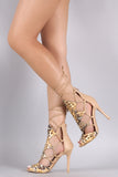 This peep toe heel features a snake print on textured vegan leather upper, caged cutout design across vamp, and lace up with pointed gold tip accent. Finished with a lightly padded insole, wrapped stiletto heel, and rear zip-up closure.