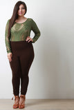 This plus size bodysuit features a mesh lace fabrication with oval patterns, long sleeve fit, and scoop neckline. Finished with a double snap button at crotch. Accessories sold separately. Made in U.S.A. 97% Nylon, 3% Spandex.
