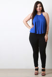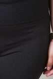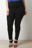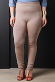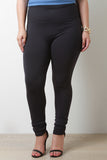 These plus size leggings feature a thick jersey knit fabrication, wide elasticized waist, and taper cut legs with cuff ends. Accessories sold separately. 65% Polyester, 20% Cotton, 15% Spandex.