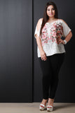 This plus size top features a engineered floral print, square neckline, cold shoulder cut out, bat wing short sleeve, boxy fit, lightweight woven fabrication, finished with a rounded back hem. Accessories sold separately. 100% Polyester.