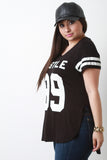 This plus size tee shirt features a "HUSTLE 99" graphic print at front, short sleeve with stripes, and high-low curved hemline. Accessories sold separately. Made in U.S.A. 97% Rayon, 3% Spandex.