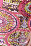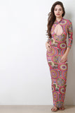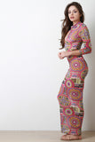 This maxi dress features a semi-sheer mesh fabrication, bohemian inspired print, front keyhole, mock neckline, and three quarter sleeves. Accessories sold separately. Made in U.S.A. 100% Polyester.