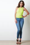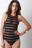 Semi-Sheer Stripe Mesh Round Neck Bodysuit