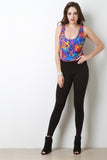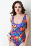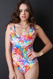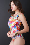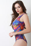 This eye-catching bodysuit features smooth stretch fabric, paint splatter print, scoop neckline, sleeveless construction, and deep scoop back. Accessories sold separately. 80% Nylon, 20% Spandex.