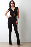This ribbed knit jumpsuit features a self-tie front, v-neckline, keyhole midsection, short cap sleeves, high waisted cinched seam, and slightly flare cut pants. Accessories sold separately. 95% Rayon, 5% Spandex.
