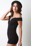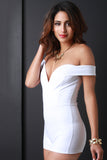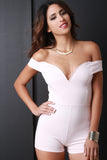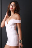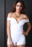 This sexy romper features stretch knit, off the shoulder neckline, v-shaped bust, and back zipper closure. Accessories sold separately. Made in U.S.A. 65.5% Rayon, 30.5% Nylon, 4% Ponti.