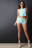 These casual shorts feature soft rib knit, elasticized waist, and self-tie drawstring. Accessories sold separately. Made in U.S.A. 55% Poly, 40% Rayon, 5% Spandex.