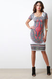 This chic dress features a smooth stretchy knit fabrication, an abstract print mirrored in front and back, scoop neckline, and short sleeves. Finished with a midi- length hemline. Accessories sold separately. Made in U.S.A. 95% Polyester, 5% Spandex.