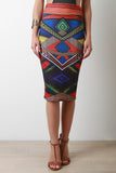 This pencil skirt features a high waist design, bold abstract geometric print, stretchy sculpturing fit, and midi length hemline. Accessories sold separately. Made in U.S.A. 92% Polyester, 8% Spandex.