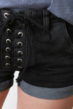These shorts feature a shoe lace up front closure detail, belt loops, 4 pockets, low waisted design, and folded hemline. Accessories sold separately. 97% Cotton, 3% Spandex.