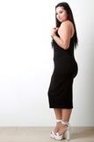 This casual dress features a jersey knit fabrication with "I SLAY" graphic pring at front, halter neckline, and sleeveless fit. Finished with a midi-length hemline. Accessories sold separately. Made in U.S.A. 95% Cotton, 5% Spandex.
