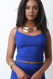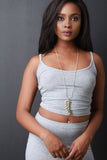 This crop top features a rib knit fabrication, scoop neckline, spaghetti straps, and slim fit. Accessories sold separately. Made in U.S.A. 95% Rayon, 5% Spandex.