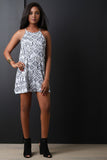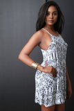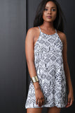 This mini dress features abstract pattern print, halter neckline, and relaxed fit. Accessories sold separately. Made in U.S.A. 95% Rayon, 5% Spandex.