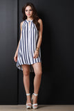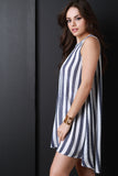 This  casual dress  features textured knit, vertical stripes, buttoned round neck, pleated front, small cut-out, sleeveless construction, and slight high-low hem. Accessories sold separately. Made in U.S.A. 100% Rayon.