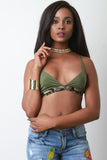 This bralette top features a soft knit fabrication, triangle top cut, spaghetti straps, and a camouflage patterned elastic band, finished with an adjustable hook and eye closure. Accessories sold separately. 65% Rayon, 35% Polyester.