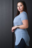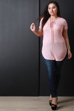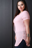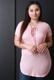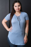 This top features a ribbed knit fabrication, deep v-neckline with strappy lace-up closure, short sleeves fit, and rounded hemline. Accessories sold separately. Made in U.S.A. 67.5% Rayon, 21.2% Polyester, 11.3% Spandex.