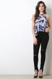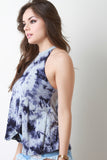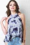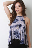 This top features a sleeveless design, mock neckline, soft rib knit fabrication, tie dye pattern, shark bite hemline, and a flare cut. Accessories sold separately. 94% Rayon, 6% Spandex.