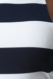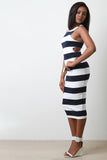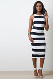 This striped knit fabrication, round neckline, sleeveless fit, racerback design, back strap with bra clasp accent, and concealed back-zip closure. Finished with a midi-length hemline and curve-hugging silhouette. Accessories sold separately. Self: 60% Polyester, 35% Cotton, 5% Spandex. Lining: 100% Polyester.