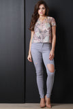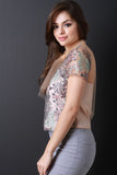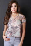 This beautiful two piece top features embroidery design an a semi-sheer fabrication, v-neck with a self-tie bow, short sleeves, and cami underlay with adjustable shoulder straps. Accessories sold separately. 100% Polyester. Lining: 97% Polyester, 3% Spandex.