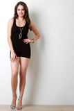 This casual romper features a jersey knit fabrication, scoop neckline, racerback design, and sleeveless construction. Accessories sold separately. Made in U.S.A. 94% Cotton, 6% Spandex.