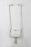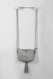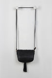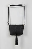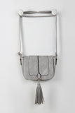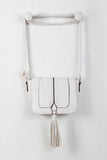 This chic handbag features vegan leather, front flap with magnetic clasp, and top zipper closure with a large single fringe tassel detail. Interior features multiple pockets and full lining. Bag is finished with adjustable shoulder strap (26" drop).