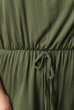 This plus size jumpsuit features a jersey knit fabrication, pleated halter neckline design, elasticized cinched waist with faux self-tie drawstring, and hook button back closure. Accessories sold separately. Made in U.S.A. 97% Rayon, 3% Spandex.