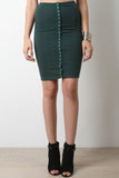 This midi skirt features soft rib knit, elasticized waist, and snap button-up front. Accessories sold separately. Made in U.S.A. 48% Rayon, 48% Rayon, 4% Spandex.