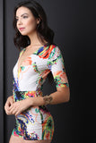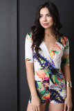 This romper features a thin stretchy knit fabrication with an abstract print of mixed colors, surplice v-neckline, and a quarter sleeves finish. Accessories sold separately. Made in U.S.A. 95% Polyester, 5% Spandex.