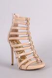 This stunning heel features a strappy construction with gold-tone hardware embellishment, open toe silhouette, low platform, and wrapped stiletto heel. Finished with lightly padded insole and rear zipper closure for easy on/off.