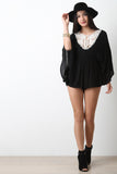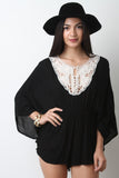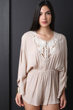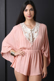 This stylish romper features a woven knit fabrication, crochet trimmed neckline detail, dolman sleeves, and self-tie drawstring at nape. Finished with an elasticized cinched waist, and ruffled hemline. Accessories sold separately. 100% Rayon.