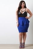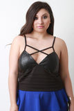 This sexy plus size crop top features vegan leather triangle cups, v neckline, adjustable spaghetti straps, cross strap detail, stretch knit fabrication, pint tuck detail, adjustable hook and eye back closure. Accessories sold separately. 100% Polyester.