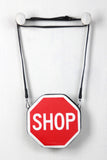 This novelty bag is an octagonal shape with a stop sign print on front and back, featuring SHOP writing. Adjustable and removable crossbody strap. Inside features full lining and open pocket. Zipper top closure.