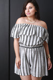 This plus size relaxed-fit striped print fabrication, elasticized off the shoulder neckline with ruffled detail, and short sleeve construction. Finished with a cinched waistline and short bottom half. Accessories sold separately. 100% Rayon.