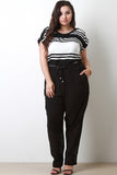 This plus size top features horizontal stripes, short sleeves with button d�cor, round neckline, and elasticized ruched sides near hem. Accessories sold separately. Made in U.S.A. 61.75% Polyester, 33.25% Rayon, 5% Spandex.