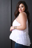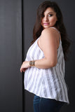 This sweet summer plus size top features a lightweight woven fabrication, vertical stripe pattern, scoop neckline, v shaped back, back vent, cross strap and a wide hem for a flowy relaxed fit.Accessories sold separately. made in U.S.A. 100% Cotton.