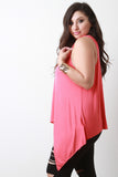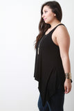 This sleeveless plus size top features a scoop neckline, soft knit fabrication, loose flowing fit, and an asymmetrical pointed hemline. Accessories sold separately. Made in U.S.A. 95% Rayon 5%, Spandex.