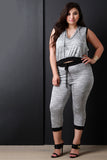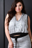 This plus size top features a marled knit fabrication with contrasting ribbed knit detail, sleeveless fit, and raw v-neckline with back hoodie. Finished with a cropped hemline. Accessories sold separately. Made in U.S.A. Self: 80% Rayon, 17% Polyester, 3% Spandex. Contrast: 86% Polyester, 10% Rayon, 4% Spandex.