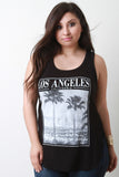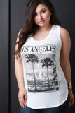 This plus size tank top features a scoop neckline, soft knit fabrication, rounded high low hemline, relaxed fit, and a graphic printed picture that says "Los Angeles California" with a picture of the city. Accessories sold separately. 97% Rayon 3% Spandex.
