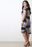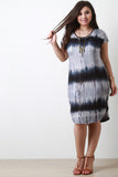 This casual plus size dress features a scoop neckline, dolman sleeves, soft knit fabrication, tie dye coloring, rounded hemline. Accessories sold separately. 97% Rayon, 3% Spandex.