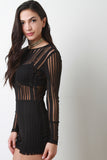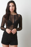 This romper features stripe burnout mesh, round neckline, long sleeves, back zipper closure, and finished with shorts lining. Accessories sold separately. Made in USA. 100% Polyester.