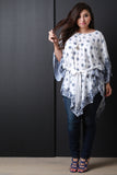 This plus size poncho floral print throughout, poncho sleeves design, self-tie sash at waist, and asymmetrical hemline. Accessories sold separately. 100% Rayon.