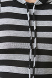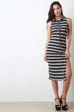 This midi dress features striped knit, hooded neckline with drawstring, sleeveless construction, and side slit. Accessories sold separately. Made in USA. 68% Polyester, 29% Rayon, 3% Spandex.