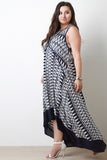 This plus size dress features a woven knit fabrication, abstract zigzag print, crochet and piping details, and sleeveless fit. Finished with a contrasting high-low hemline. Accessories sold separately. 100% Rayon.