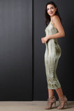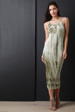 This maxi dress features tie dye jersey knit, scoop neckline, and spaghetti straps that criss cross at back. Accessories sold separately. Made in USA. 96% Rayon, 4% Spandex.