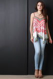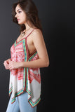 This colorful top features a woven knit fabrication with Native American inspired print detail, v-neckline, adjustable spaghetti straps, and asymmetrical hemline. Accessories sold separately. 100% Polyester.