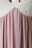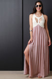 This alluring maxi dress features a woven fabrication, two tone design, fitted chest cut out bodice, lace up cross back, gathered maxi skirt, double knee high slits, with an invisible side zipper closure. Accessories sold separately. 100% Rayon.